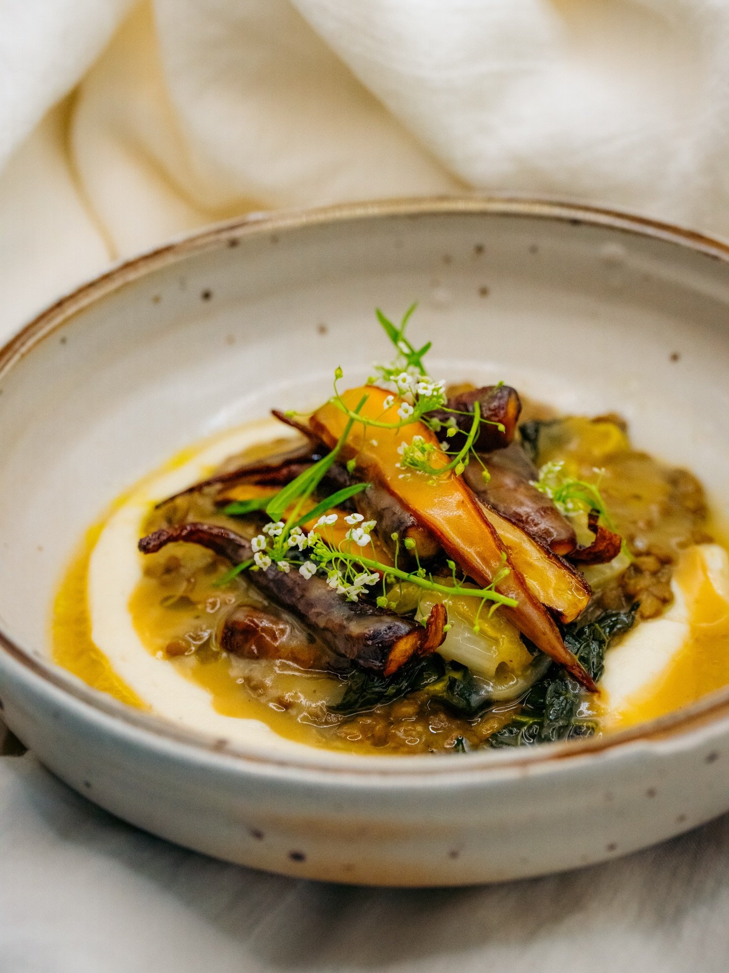 Slow-simmered lentils bathed in rich chicken jus, honey-roasted carrots, tender braised cabbage and kale. Finished with a tangy celery root purée whipped with yogurt for balance and brightness.
