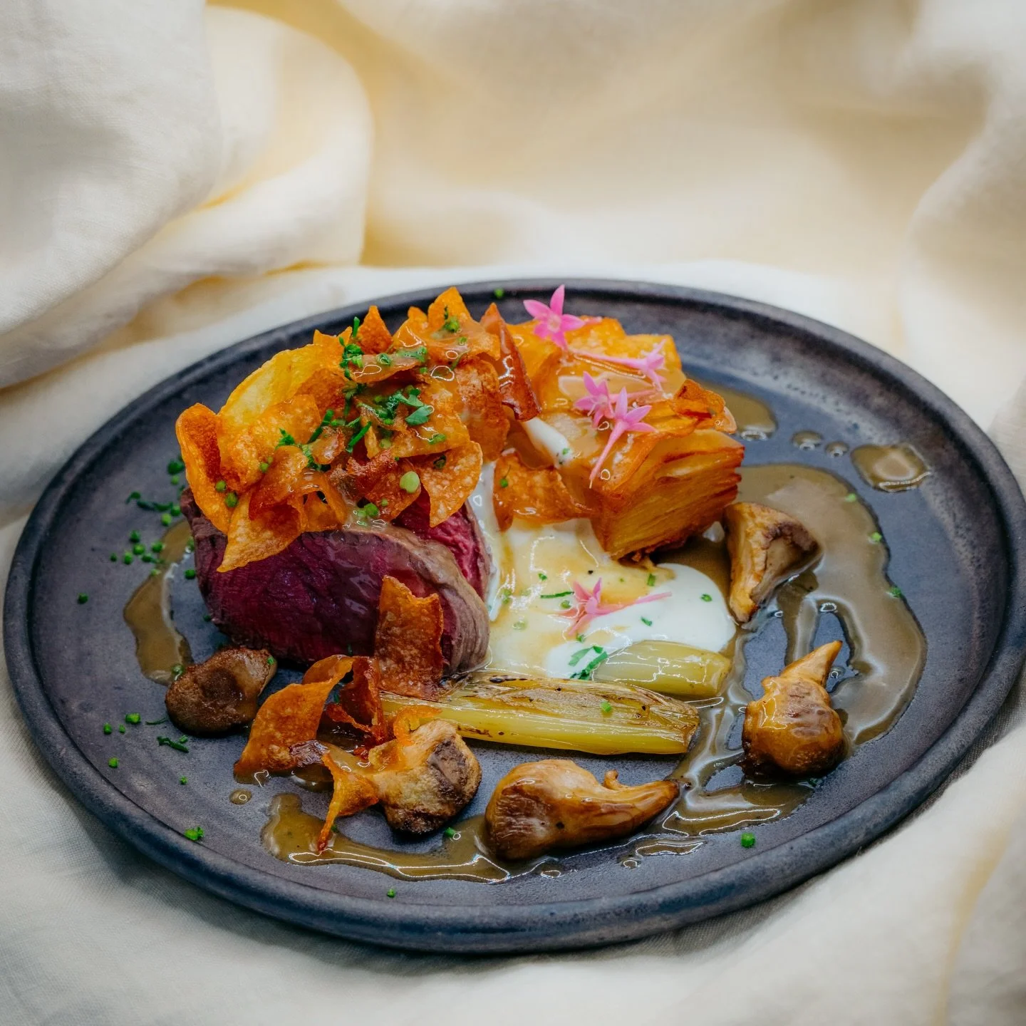 View fullsize Snake River Farms Tenderloin Beef, Brown Butter Potato Pavé With Crisp Chips, Earthy Lion’s Mane Mushrooms, And Leek Confit, Brightened With Whipped Ricotta & Lemon.